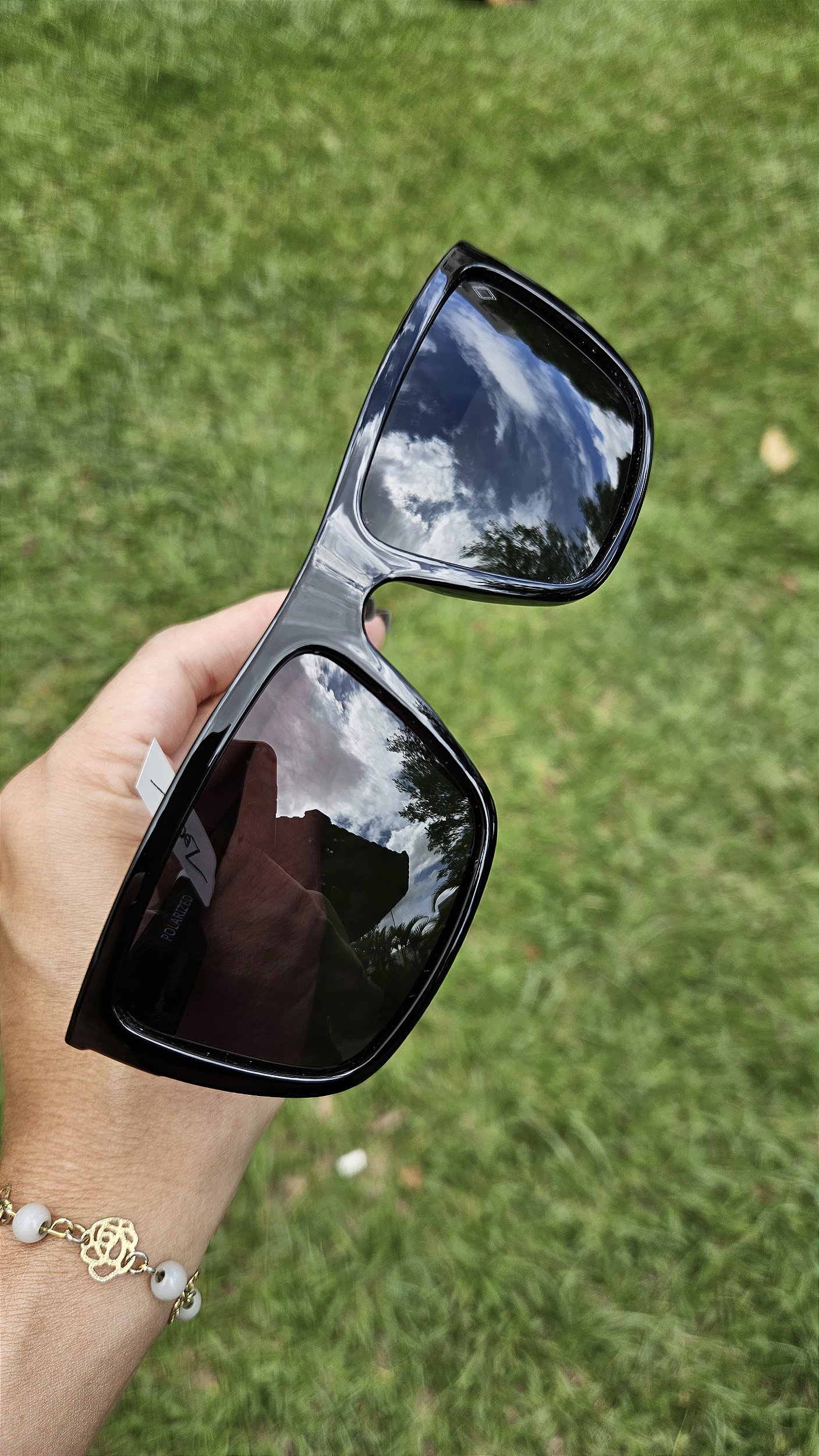 Óculos De Sol Tamanho grande, Haste acetato. Todo preto com lentes escuras.